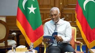 Ahmed Saleem, recipient of the Most Distinguished Foreign Service Medal and the first President of the Human Rights Commission of the Maldives (HRCM), has presented President Dr Mohamed Muizzu with a copy of his book 'HRCM ge Han'dhaanthah.’